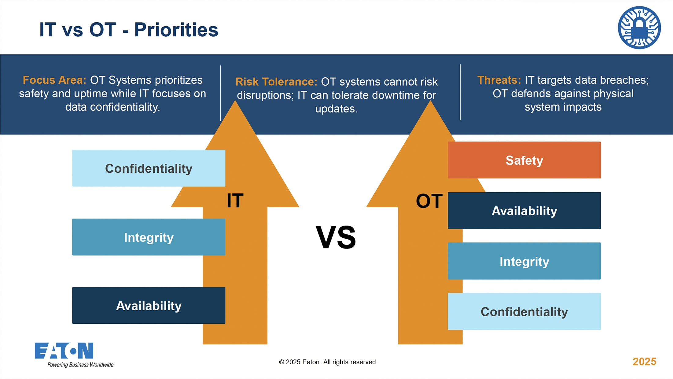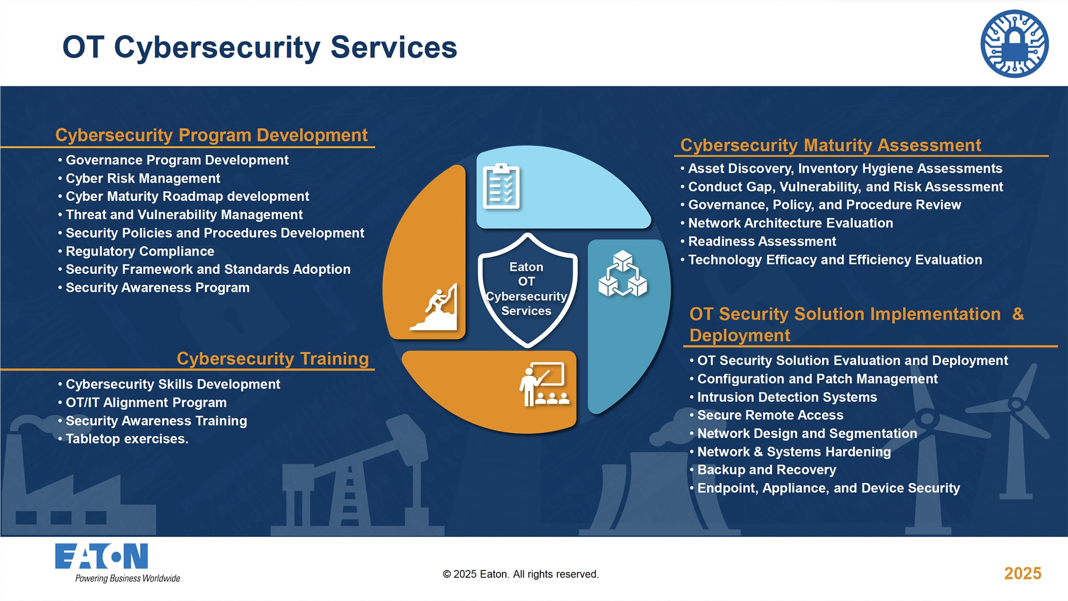 米軍基地・防衛施設向けに、Eaton社と連携したOTサイバーセキュリティ対策を提供します。CMMC、RMF、ATO対応を前提としたリスク評価・設計支援・導入サポートにより、仕様段階から運用までをトータルに支援。設備停止や障害リスクを最小化し、安定した設備運用を支えます。